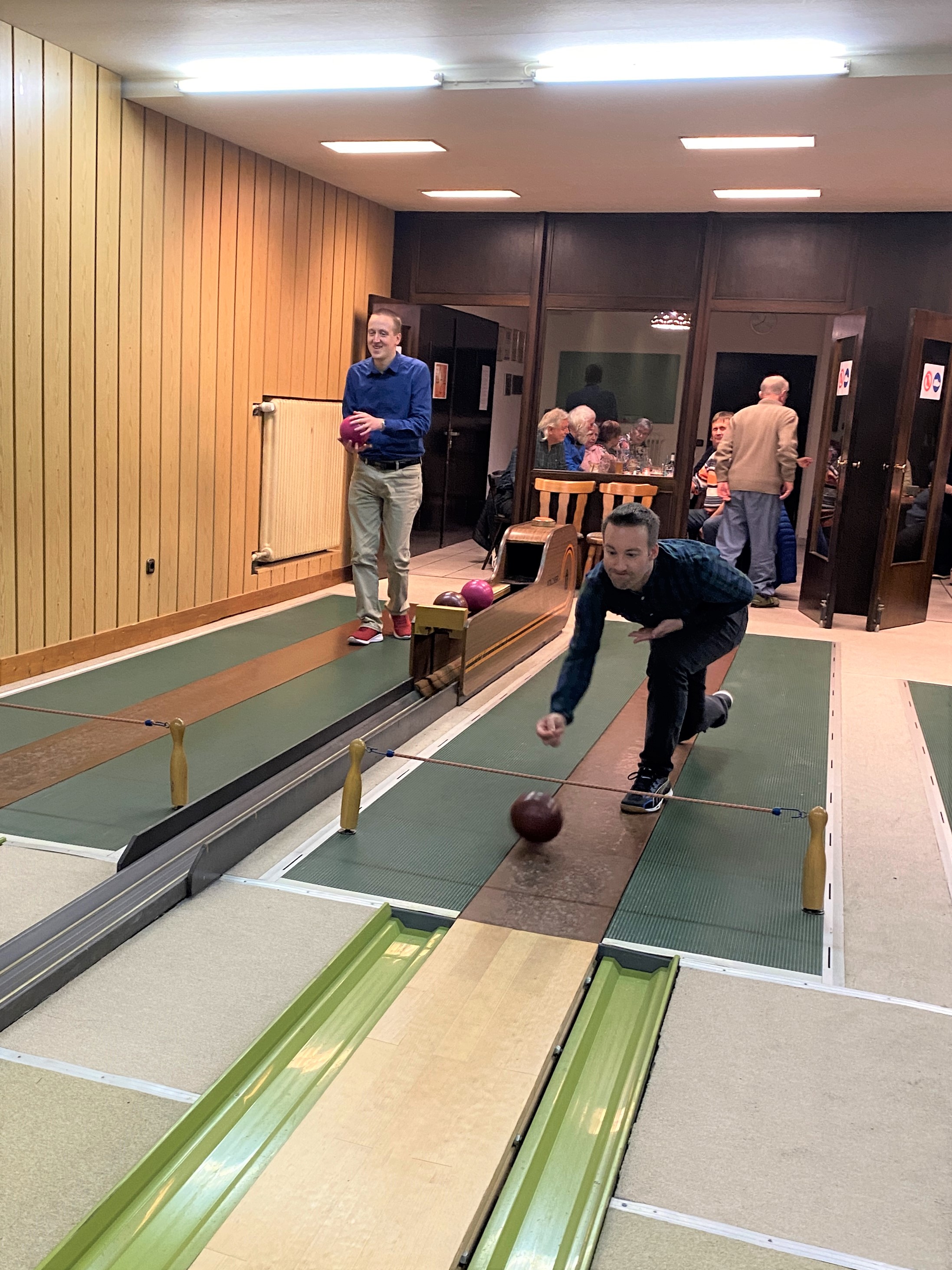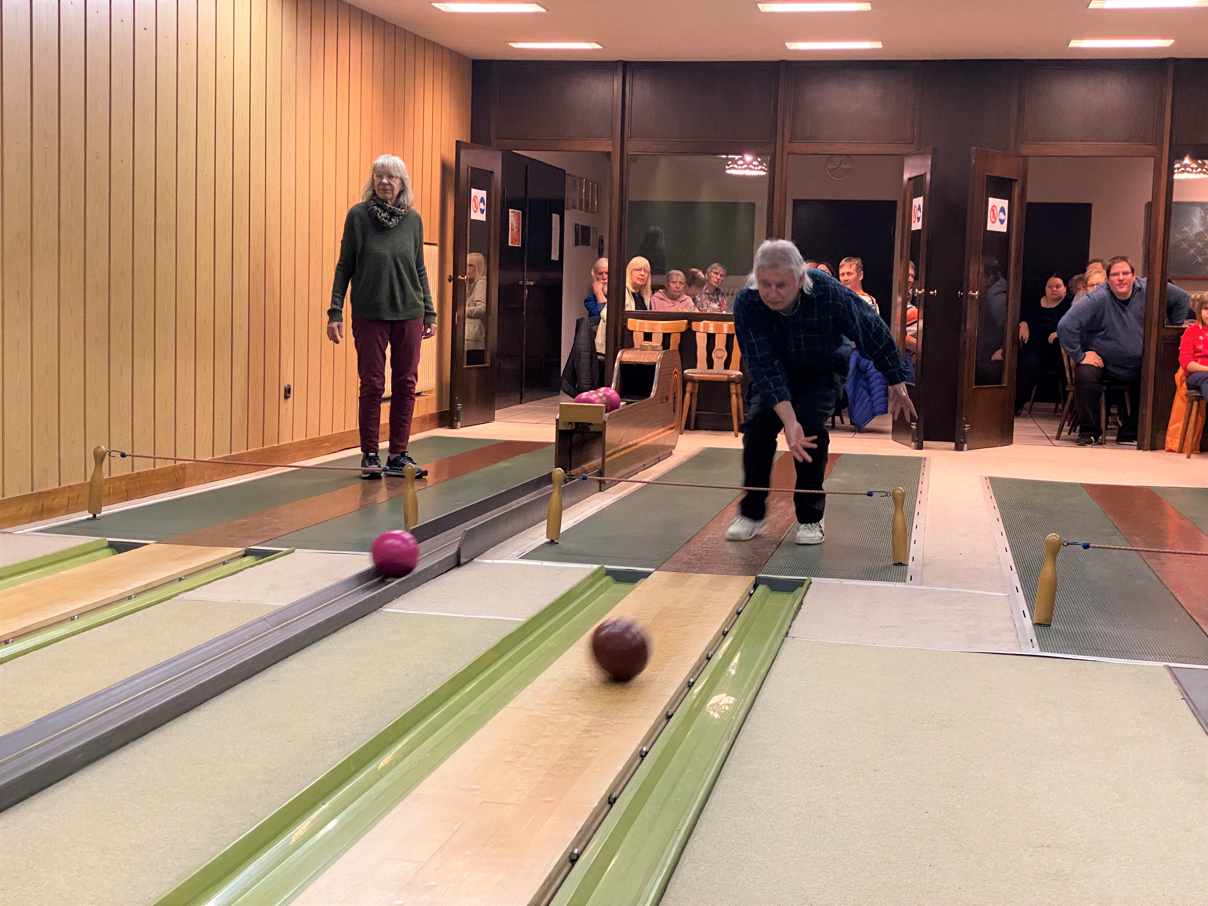 Doch zuvor wurde es erst mal sportlich bei den Minigolfern. Nach kurzer Einspielzeit auf den Kegelbahnen gab es von der zweiten Vorsitzenden Yvonne Slomma und der Kassiererin Britta Spandau noch kurze Informationen über diverse Spielabläufe. Dann ging es auch schon rund mit Tannenbaumkegeln und dem Spiel 111, wonach bei einer Schnapszahl alles wieder gelöscht wurde. Aufgeteilt in zwei großen Gruppen hatte man sich untereinander vehement angefeuert, allen voran Dienstältester Manfred Meißner, der mit seinen über achtzig Jahren den Jüngeren noch etwas vormachte. Auch das jüngste Mitglied, Emma Spandau, machte kräftig mit, die sich als Einzelkämpferin, diesmal ohne Freundin Lina, allein durchsetzen musste. Dabei kam bei allen so viel Freude auf, dass das Spiel 111 gleich dreimal hintereinander weggespielt werden musste. ,,Die Zeit ist ja wie im Flug vergangen, soviel Spaß hatte es uns gemacht," meinte Cornelia Kampe nach Spielschluss. ,,Das sollte alles unbedingt so beibehalten werden," fand auch Jörg Gehrke, der mit seiner Familie ebenfalls ganz Feuer und Flamme war und sich jetzt auf das leckere Weihnachtsessen im Anschluss freute.